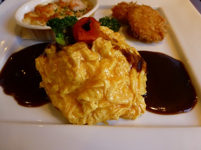 オムライス・海老マカロニグラタン・帆立のフライ・サラダ・スープ・デザート。