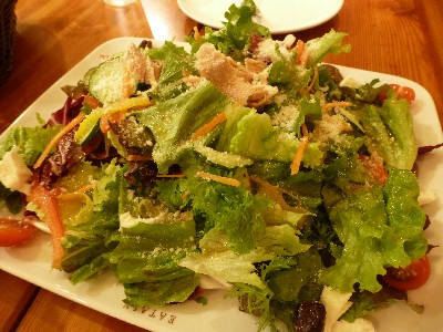 オリーブオイルベースのシンプルなサラダ。パルメザンチーズがかかってた。