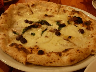たっぷりのたまねぎとチーズをベースに、アンチョビとオリーブをトッピングしたピッツァ。