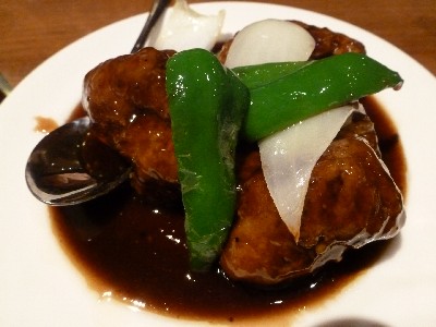 豚バラ肉の塊3つにたまねぎとピーマンが添えられてる。