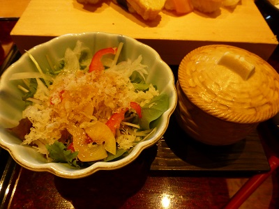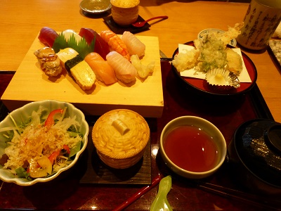 寿司、天ぷら、そば、さんが焼き、茶碗蒸しがセットになった『お楽しみ御膳』にしようと思ったら、セットのそばが温かいものしか出ないって言うので変更。