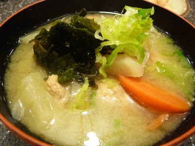 大きなつみれが3個、大根、人参、わかめ、長ねぎ。