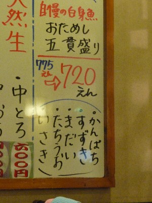 順番が違ったけれど、白身の特徴を見て〔かんぱち、いさき、たちうお、まだい、すずき〕かな?と。