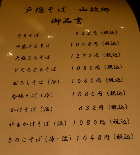 メニューはざる、とろろざる、おろし(冷)、香梅そば(冷)、かけそば、やまかけ(温)、きのこそば(冷・温)