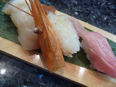 極み三貫(大トロ、ぼたんえび、ほたて貝柱)