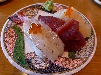 寿司は玉子・えび・いか・まぐろ・かんぱち。わさび結構多めだった。