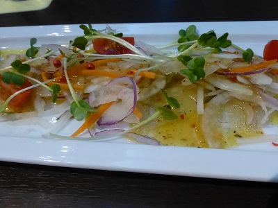 赤玉ねぎ、みょうが、かいわれ、キュウリなどをあしらったカルパッチョです。