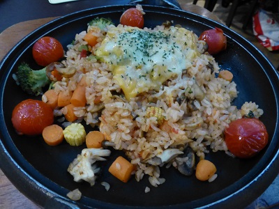 あっさりめに仕上げたトマト風味のピラフはご飯ものにしてはそんなに重くない。