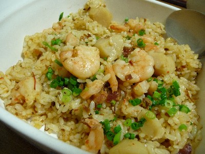 米、バナメイエビ、帆立貝、ベーコンビッツ、 XO醤、ネギ...etc