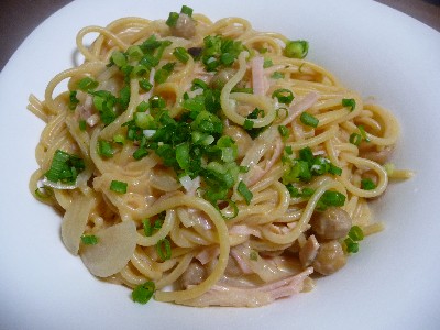 (スパゲティ100g、ハム、玉ねぎ、ビーンズ、豆乳、ブルサンチーズ、ケチャップ、バター、小ねぎ)