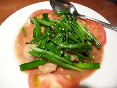 小振りのホタテ(だと思う)のバターソテーの上にニラが乗っていて、炒め合わせてる感じではない。