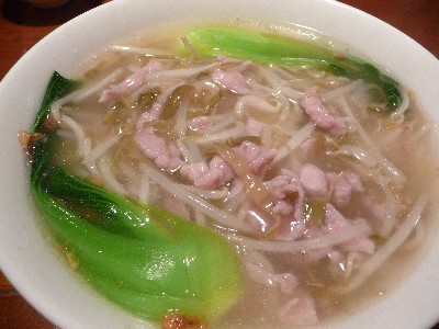 細めのこま切れの豚肉(ほんのりピンクだったw)ザーサイ、もやし、青梗菜とシンプル。