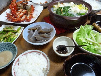 (たら、絹ごし豆腐、春雨、白菜、人参、大根、春菊、えのき、ポン酢、ごまだれ)