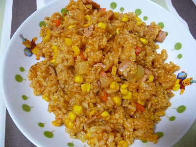 ケチャップライス:877kcal (ごはん、ソーセージ、玉ねぎ、コーン、人参、ケチャップ、バター)