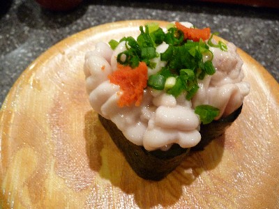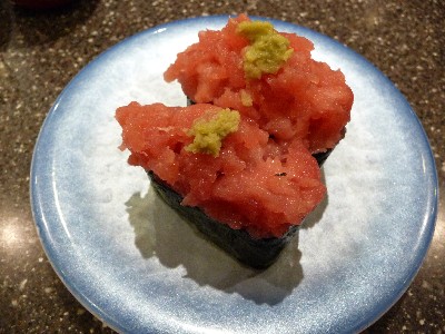 上にチョコッとわさびが。ずいぶんあとにねぎとろ軍艦も流れてきました。