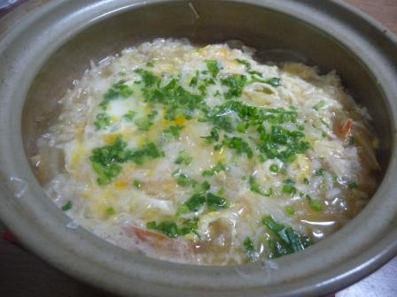 今日の雑炊は野菜(大根、にんじん、エリンギ、長ねぎ)と溶き卵、仕上げに小ねぎをパラリと。