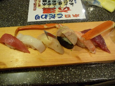 本鮪上赤身、生するめいか、昆布〆ひらめ、生かつお、ずわいがに足一本にぎり、あんきも軍艦