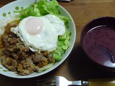 (ごはん、生姜焼き〔黒豚ロールステーキ、玉ねぎ、生姜、調味料〕、目玉焼き、レタス)