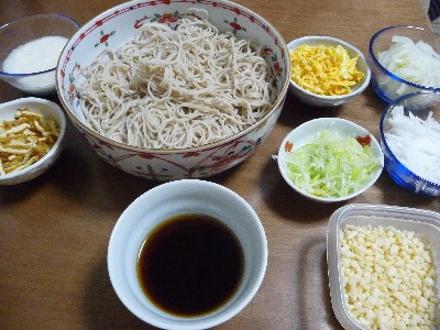 (そば、めんつゆ、油揚げ、錦糸卵、とろろ、大根の千切り〔生/茹〕、揚げ玉、長ねぎ)