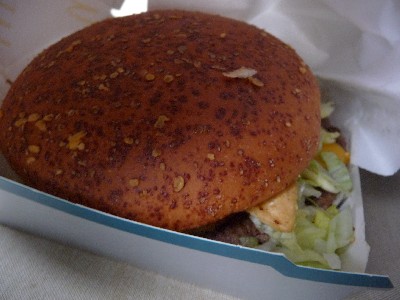 100%ビーフのパティの上にとろけたチーズの千切りレタスが散らばってたw