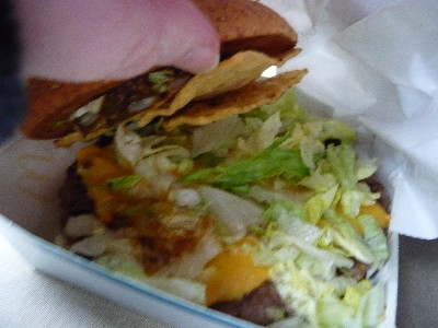 タコスのソースでトルティーヤは上のバンズにくっついて、