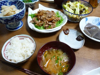 豚小間切れ肉の生姜焼き:304kcal (豚小間切れ肉、玉ねぎ、生姜、調味料、水菜)