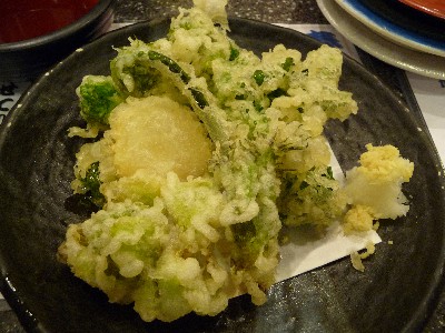 春野菜の天ぷらは菜の花、ふきのとう、こごみ、くわい、たらの芽の天ぷらの盛り合わせ。