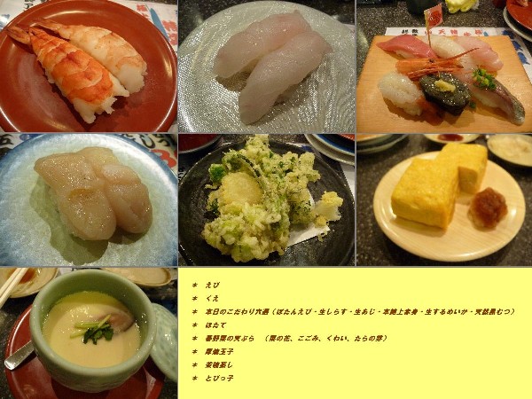 (えび・くえ・〔ぼたんえび・生しらす・生あじ・本鮪上赤身・生するめいか・天然黒むつ〕・ほたて・とびっこ)