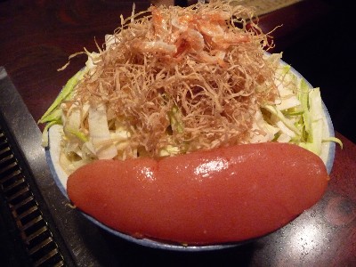 焼きあがってきたら真ん中に明太子を乗せて、さらに混ぜ混ぜ・・・