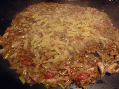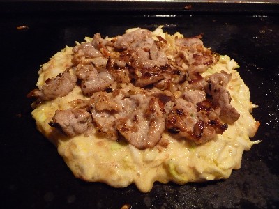まずは豚肉を炒めて端に寄せ、生地を焼き、炒めた豚を乗せてひっくり返す。