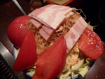 トマトとキャベツなどの具は鉄板と丼のふちを平行に保ちながら入れる。