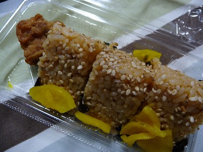 とりめしおむすび@ワイズ:435kcal(とりめしおむすび3個、から揚げ1個、たくわん)