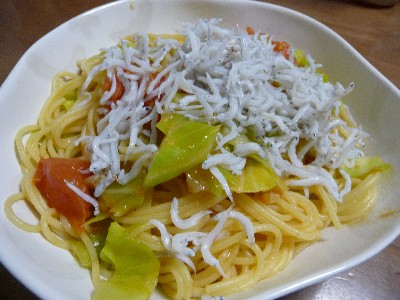(スパゲティ、トマト、キャベツ、アンチョビ、にんにく、オリーブ油、釜揚げしらす、タバスコ)