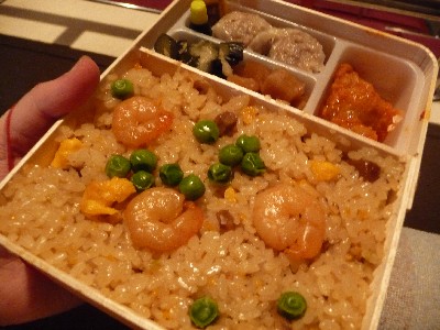 (チャーハン、シュウマイ2個、鶏のチリソース、きゅうり漬、筍煮)