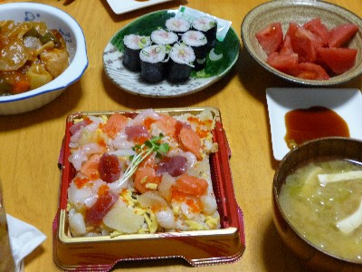 (五目寿司、まぐろ、いか、さけ、小柱、甘海老、数の子、とびっこ、のり、錦糸卵、貝割れ)