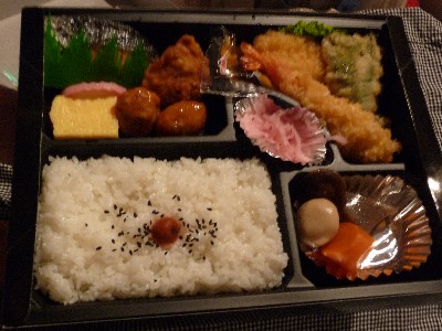 (ごはん、天ぷら〔海老、イカ、ピーマン〕、焼き鮭、鶏唐揚1個、肉団子2個、玉子焼、かまぼこ、漬け物、煮物〔里芋、人参、椎茸、こんにゃく〕)