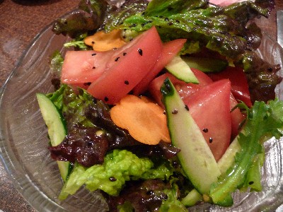 レタス、サニーレタス、春菊、トマト、きゅうり、人参。ドレッシングは甘め。