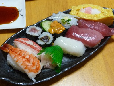 寿司:488kcal (まぐろ2貫、いか、えび、かに、白魚、うに、鉄火巻、かんぴょう巻、玉子)