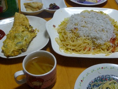 (カッペリーニ、トマト、キャベツ、にんにく、アンチョビ、オリーブ油、しらす)