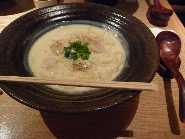 (うどん1.5玉、クリームスープ、帆立5個、三つ葉)