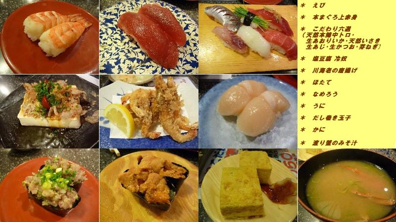 寿司:625kcal(えび、本まぐろ上赤身、ほたて、なめろう、うに、かに)