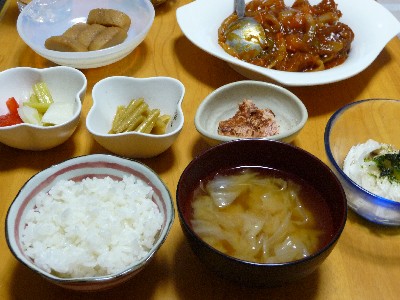 からあげの甘酢あんかけ:370kcal (からあげ、玉ねぎ、ピーマン、人参、甘酢)