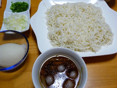 (そうめん、なめこ入りつゆ、大根おろし、長ねぎ、小ねぎ、唐辛子)