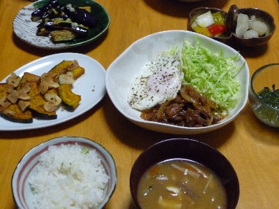 (牛焼肉炒め〔牛小間切れ肉、玉ねぎ、焼肉のタレ〕、キャベツの千切り、目玉焼き)