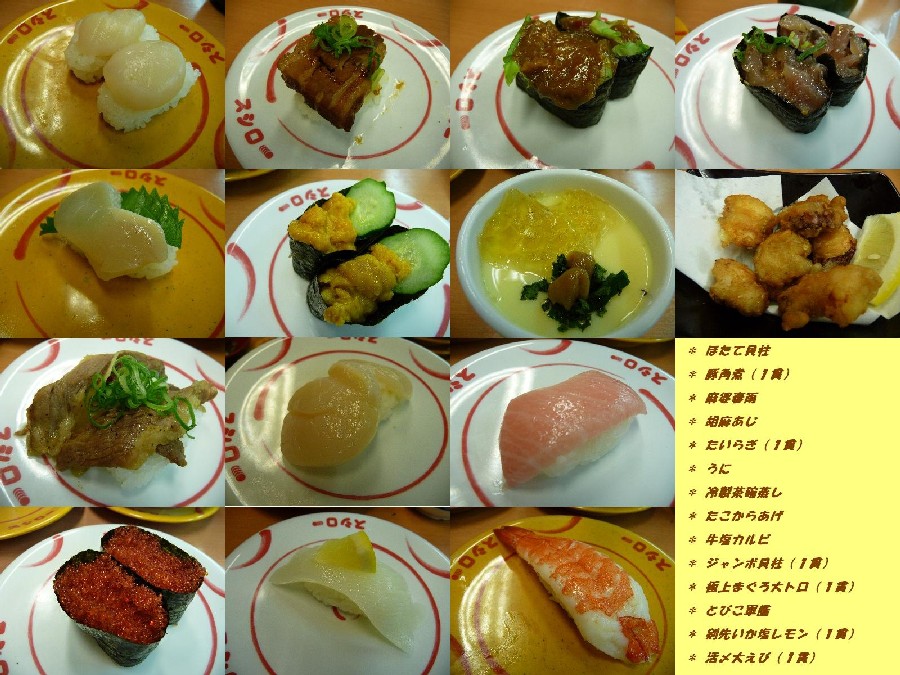 胡麻あじ:115kcal、たいらぎ〔1貫〕:47kcal、うに:81kcal、牛塩カルビ:146kcal、