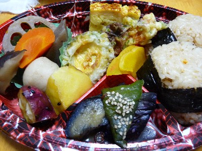 玉子焼き、さつまいもの煮物、煮物〔れんこん、人参、椎茸、こんにゃく、里芋〕)