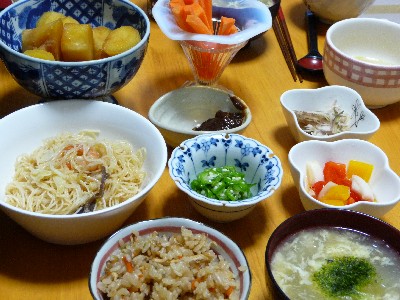 みょうがの炊き込みごはん 1.5杯:478kcal (みょうが、油揚げ、人参)