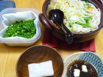 (塩ちゃんこ鍋つゆ、うどん〔乾麺〕、餅、キャベツ、人参、大根、水菜、小ねぎ、ポン酢、バター)
