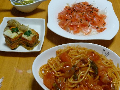 (スパゲティ、ベーコン、玉ねぎ、ピーマン、トマト、ケチャップ、バター、パルメザンチーズ、タバスコ)