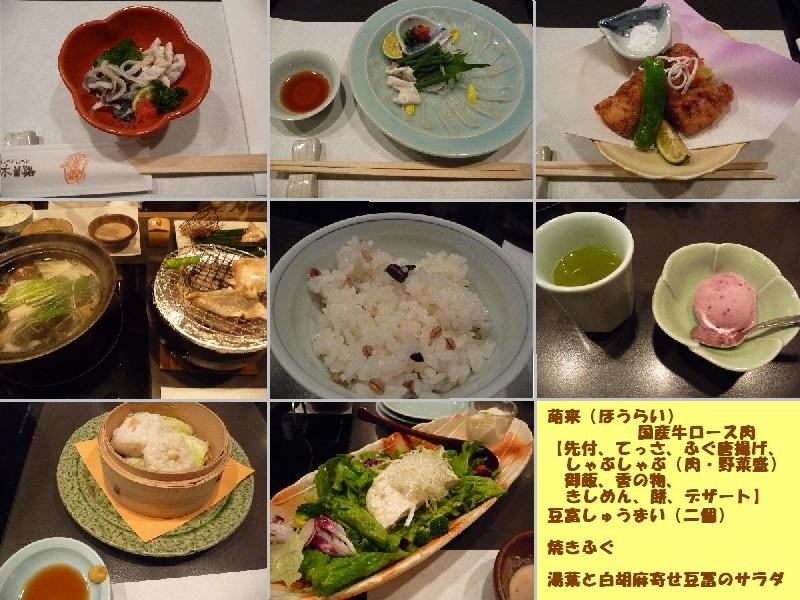 (先付、てっさ、ふぐ唐揚げ、しゃぶしゃぶ(肉・野菜盛〔白菜、もやし、水菜、春菊、人参、えのき、椎茸、豆腐、マロニー、わかめ、〕ポン酢、ごまだれ)、きしめん、餅、御飯、香の物、デザート)